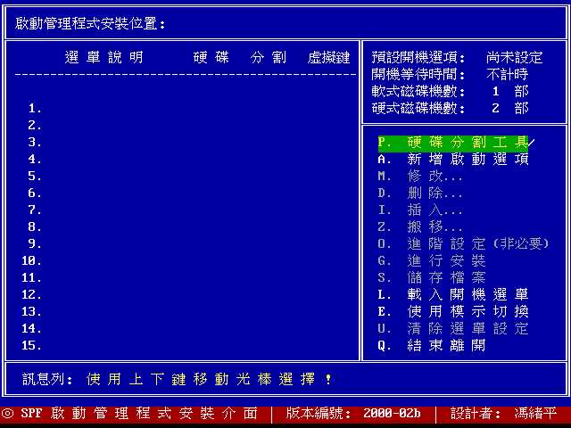 SPFdisk 是一套由國人開發完成的全中文介面的硬碟分割工具,他要比微軟出的 Fdisk 功能強多了,他的好處除了==>全中文介面讓你一定可以看的懂之外,簡單的類圖形介面可以讓你輕易的進行硬碟分割,除此之外,這套軟體的『DOS工具』內的『格式化工具』格式化硬碟的速度真是 DOS 比不上的,我格式化一個 30GB 的硬碟不用十秒就可以格式化完全!<==另外,其他的優點我在此也不多說了,若有需要你可以自行自一些搜尋網站下載最新的程式,或從這裡下載我有的程式,不過可能舊一點。另外,由於 DOS 的 Fdisk 並不認識 Linux 的分割表,所以用 DOS 的 Fdisk 是無法將 Linux 的分割表去除的。因此,你要刪除 Linux 的分割表,只有兩個比較快的方法,一個是以 Linux 直接再分割,一個則是使用 SPfdisk 分割啦!