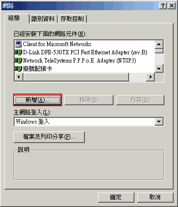 由於區域網路是由一些網路的通訊協定所驅動形成的(關於各種通訊協定請參考 study-area 的說明),所以請一定要在網路的組態內加入下列的通訊協定,當然,在您網域內的所有電腦均需要做以下的設定!要確認您的設定有沒有問題,請到這裡一步一步的檢查一下您的設定喔!OK!那我們開始安裝通訊協定吧! 請特別注意,除非你的網路系統中有 IPX/SPX 之類的伺服器,否則就不要安裝 IPX/SPX 這一個通訊協定,不然你的 Windows98 連 Windows2000 的速度會跟烏龜一樣慢喔!TCP/IP NetBEUI(或 NetBIOS )