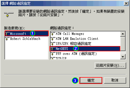 點選【Microsoft】-->點選【NetBEUI】通訊協定-->按【確定】鈕。按完『確定』之後會顯示成如下圖所示。重複上面新增的步驟,以增加其他的通訊協定。然後開始增加使他人可以用你的檔案及印表機的選項: