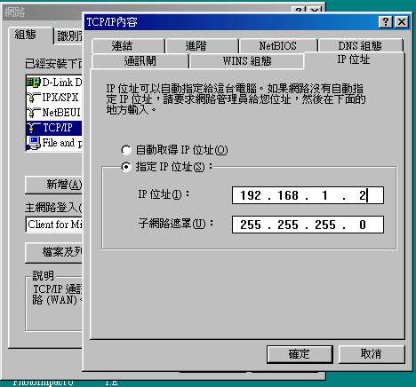我們設置的這個虛擬網路 IP 是 192.168.XXX.XXX 的形式,你可以完全照 VBird上面的設定來輸入,亦即輸入 192.168.1.2 這一個 IP ,子網路遮罩則同樣的輸入:255.255.255.0,你可以不用知道子網路遮罩的意義,不過,如果你想要有更深入的認識,還是建議你到這裡來學習一下吧!另外,需要注意:
