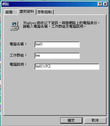 開始設定你的區域網路的工作群組與電腦名稱: 點選【識別資料】頁面,如下圖所示分別輸入您想要的工作群組與電腦名稱: