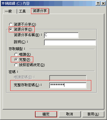 在下圖中核選【資源分享】,請設定資源分享的名稱,然後存取類型可依個別喜好來設定,如果你這個資料很重要,不希望被刪除掉的話,最好選擇唯讀;但如果是一般家庭的網路系統的話,通常就直接設『完整』了,反正都是自家人,不過,由於最近的 Nimda 病毒相當的恐怖,所以這裡還是建議:另外要注意的是,如果你選擇了『按照密碼決定』時,你就必須要輸入兩組密碼喔!