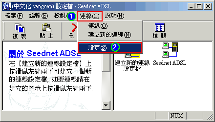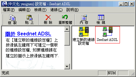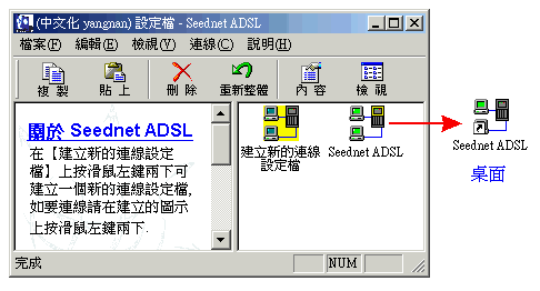 1.設定完成後直接將 Seednet ADSL 連線程式拖放於桌面供以後手動連線. |