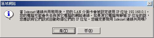 然後將『啟動這個連線的 Internet 連線共用』打勾,再按確定,會出現下面的畫面: