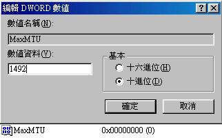 - 將新增的機碼取名為『MaxMTU』,並且在新增加的那個機碼上面按右鍵,選『修改』,會出現如下畫面,選擇『十進位』後,輸入剛剛我們找到的那一個 MTU 值: