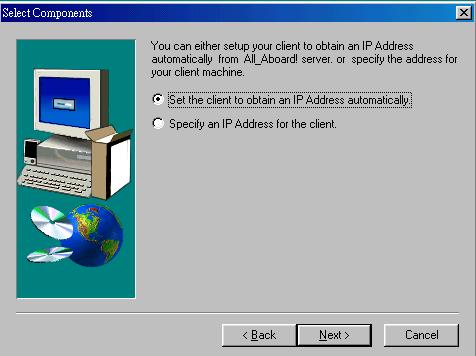 安裝用戶端的電腦就更簡單了。由於主機在安裝完了 All Aboard 之後,就成了具有 DHCP 服務的主機,所以在你的用戶端電腦上,安裝 All Aboard 就很簡單。