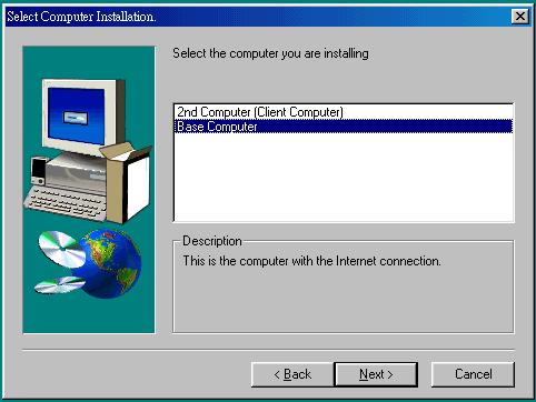 到此為止,主機端的設定就 OK 了!在你重新開機之後,你會發現螢幕右下方多了一個有點像是恐龍的小圖示,那就是安裝完成啦!這時候你要做的就是請撥接上網吧,撥接完成之後,請確定你的 Internet 是沒問題的,然後請再繼續安裝你的用戶端 PC ! 註:最重要的是第三步驟,請必定選擇 Base Computer!