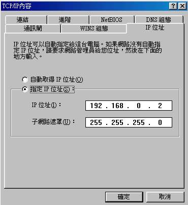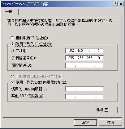 在上圖中,輸入這部電腦的 IP (192.168.0.xxx),而且子網路遮罩一定是『255.255.255.0』