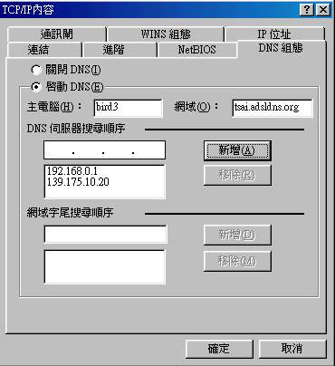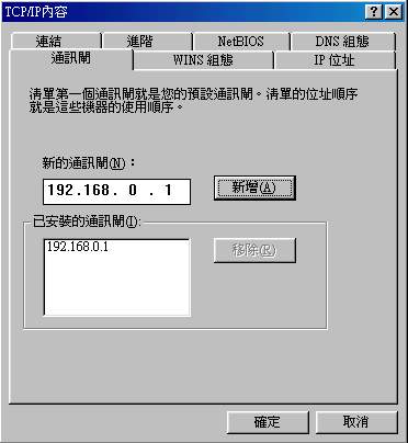 在這個畫面中,輸入 192.168.0.1,並按『新增』則電腦會將你的網路卡連接到主機那張網路卡上面去啦!基本上,到這裡就已經設定完畢了!不過,你可以再輸入一下你慣用的