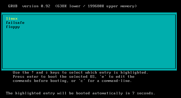 基本的說明已經在上表當中了,這裡需要在說明的是關於 default 開機檔的計算。如果今天我有四個開機設定檔,那麼 default 算的是什麼呢?就是『排序』啦!假如我底下依序出現的設定檔 title 分別是 linux, linux-test, windows, failsafe 的話,那麼開機的時候, grub 的選單就會顯示: