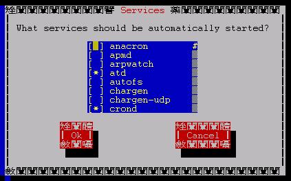 這裡顯示的是,目前系統上以 RPM (或者是你自己寫的)可以進行『開機時後啟動的』服務項目,以這張圖表為例,顯示出 atd 這支服務在啟動的時候就會自動的啟動囉!所以你可以移動到你所想要啟動的項目之前,按下空白鍵使產生 * 後,再按下 OK 即可!不過需要注意的是: