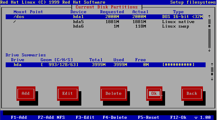 基本上你會看到類似上面的話面,總共會顯示你的目前硬碟的磁區,如上面說的,『 Primary IDE 的硬碟中的 Mater 為 hda 』!這點請特別留意囉!好了,如果你要將舊有的 FAT 磁區安裝 Linux 的話,那麼你就必須將該磁區『 Delete 』掉才行,不論如何,請看一下你的剩餘硬碟資料空間(註:常常有很多的朋友來信問到,咦!我的 E 槽明明還有 5GB 的空間,為什麼不能安裝 Linux 呢?!就是這個問題啦!因為 Linux 的磁區與 Windows 的 FAT 並不相同呀!所以你必須將原有的 FAT 磁區砍掉後,才能規劃出新的 Linux 磁區呀!所以要看一下硬碟的 Free 喔!)我這裡建議的分割方式有幾種(請注意,第三個安裝的選項是關於 Proxy 的設定方面,如果你要安裝 Proxy 套件的話,才建議多加這些磁區!因為據說這樣分割的硬碟會讓 Proxy 的效能比較好!):
