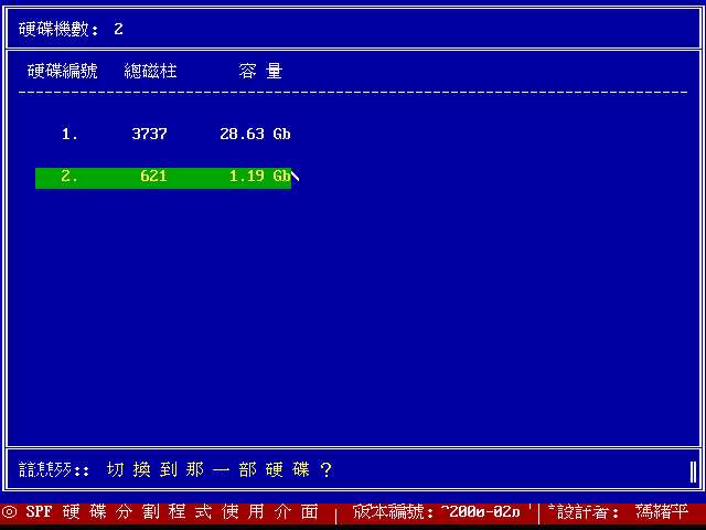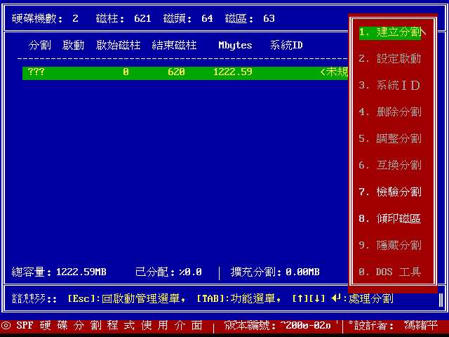 SPFdisk 是一套由國人開發完成的全中文介面的硬碟分割工具,他要比微軟出的 Fdisk 功能強多了,他的好處除了==>全中文介面讓你一定可以看的懂之外,簡單的類圖形介面可以讓你輕易的進行硬碟分割,除此之外,這套軟體的『DOS工具』內的『格式化工具』格式化硬碟的速度真是 DOS 比不上的,我格式化一個 30GB 的硬碟不用十秒就可以格式化完全!<==另外,其他的優點我在此也不多說了,若有需要你可以自行自一些搜尋網站下載最新的程式,或從這裡下載我有的程式,不過可能舊一點。另外,由於 DOS 的 Fdisk 並不認識 Linux 的分割表,所以用 DOS 的 Fdisk 是無法將 Linux 的分割表去除的。因此,你要刪除 Linux 的分割表,只有兩個比較快的方法,一個是以 Linux 直接再分割,一個則是使用 SPfdisk 分割啦!