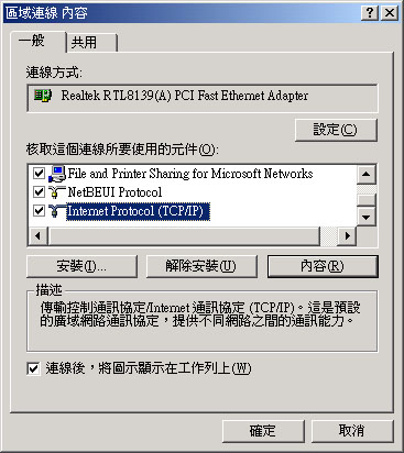 - 然後選擇『Internet Protocol (TCP/IP) 』那一項,之後按下內容,會出現選項: