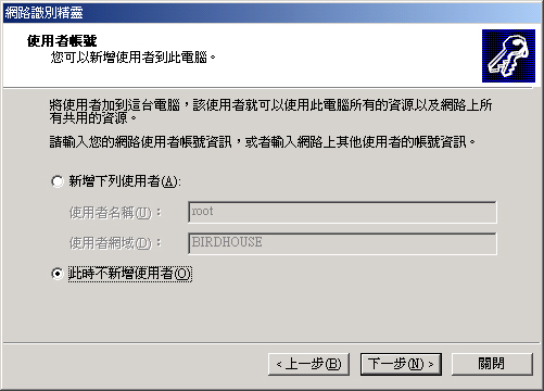 # VBird 有時候會有點龜毛,既然我的 /etc/passwd 裡面會有 SAMBA 用的機器碼, # 那麼我就將這幾個機器代碼歸類在特定的 group 之內,那就自訂一個名為 # smbmachine 的 Machine group 好了! ^_^ [root@test root]# useradd -g smbmachine -d /dev/null -s /bin/false bird2000$ [root@test root]# useradd -g smbmachine -d /dev/null -s /bin/false bird98$ [root@test root]# smbpasswd -a -m bird2000$ [root@test root]# smbpasswd -a -m bird98$ # 注意啊!多了一個 -m 的參數,這個參數代表後面接的為 Machine account , # 而不是一般設定的 User account 喔! [root@test root]# usradd bird [root@test root]# smbpasswd -a bird # 假設 bird 這個使用者還沒有被建立,那麼您應該這樣建立他! [root@test root]# smbpasswd -a root # 記得要將 root 的身份設進去 smbpasswd 裡面喔! # 不過,只要在 Windows 2000 的登入設定完成之後,就可以將 root 取消掉了! |