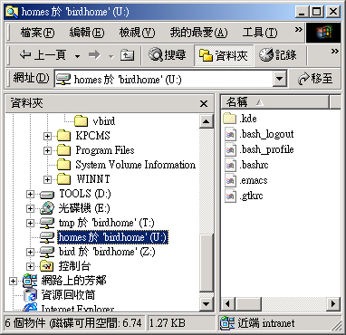 [root@test root]# smbmount \\netbiosname\directory [-o options] 參數說明: netbiosname :可以是 IP 也可以是網芳上面的NetBIOS主機名稱 -o 後面接的參數 options 常用的有底下這些參數: username=你的登入帳號:例如 username=bird password=你的登入密碼:需要與上面 username 相對應啊! codepage=語言格式:這個可以設定支援的語系,例如繁體中文:codepage=cp950 範例: # 假設我要以 bird 身份,密碼為 mypasswd 掛載遠端主機 \\birdhome\tmp # 那個目錄,並且掛載到我 Linux 的 /home/birdhome 這個目錄,如何做? [root@test root]# smbclient -L \\birdhome -U bird # 先以 smbclient 找出可以掛載的目錄!在這個案例中,我有 \\birdhome\tmp # 可以掛載! [root@test root]# smbmount '\\birdhome\tmp' /home/birdhome \ > -o username='bird',password='mypasswd',codepage='cp950' # 再次給他強調一下,因為 \ 在 bash 當中是特殊字元,所以掛載時請特別 # 使用 ' 來將 \ 設定成為一般字元!還有,在 -o 後面的各項參數中, # 中間都是以逗號來隔開的!並且設定值最好也使用單引號 ' 來設定! [root@test root]# df //birdhome/tmp 3020160 186880 2833280 7% /home/birdhome # 如上所示,你應該就可以看到目錄對應 mount point 啦! |