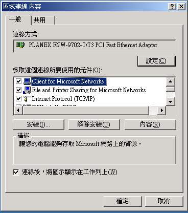 在上圖中於『區域連線』按右鍵選內容,會出現如下畫面,顯示使用的界面為 PLANEX 這塊卡,並且已經安裝了一些常用的通訊協定,如果你沒有這些通訊協定的話請按『安裝』選擇『通訊協定』後,增加通訊協定吧!(請注意喔!只要 TCP/IP 及 NetBEUI 即可,其他的不需要喔,詳細請看一下 TCP/IP 的迷思 一文!)